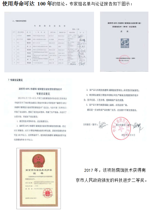 2010年,針對各地公路用熱鍍鋅波紋鋼管涵洞的腐蝕條件和行業(yè)防腐要求, 我公司與中國防腐蝕協(xié)會及南京工業(yè)大學(xué)、南京工程學(xué)院、中國石化集團(tuán)金陵石化公司等單位合作研究,借鑒及創(chuàng)新了其它領(lǐng)域的高壽命的成熟防腐技術(shù),將有機(jī)材料與無機(jī)超硬質(zhì)礦物材料融合,成功的取得了埋地用鋼結(jié)構(gòu)的熱浸鍍鋅加熱熔結(jié)塑料陶瓷的綜合防腐技術(shù),并已在國內(nèi)高速公路埋地式鋼質(zhì)波紋管涵洞結(jié)構(gòu)中運(yùn)用,效果顯著,獲得行業(yè)好評。2017 年,該項技術(shù)獲得南京市人民政府頒發(fā)的科技進(jìn)步二等獎。
